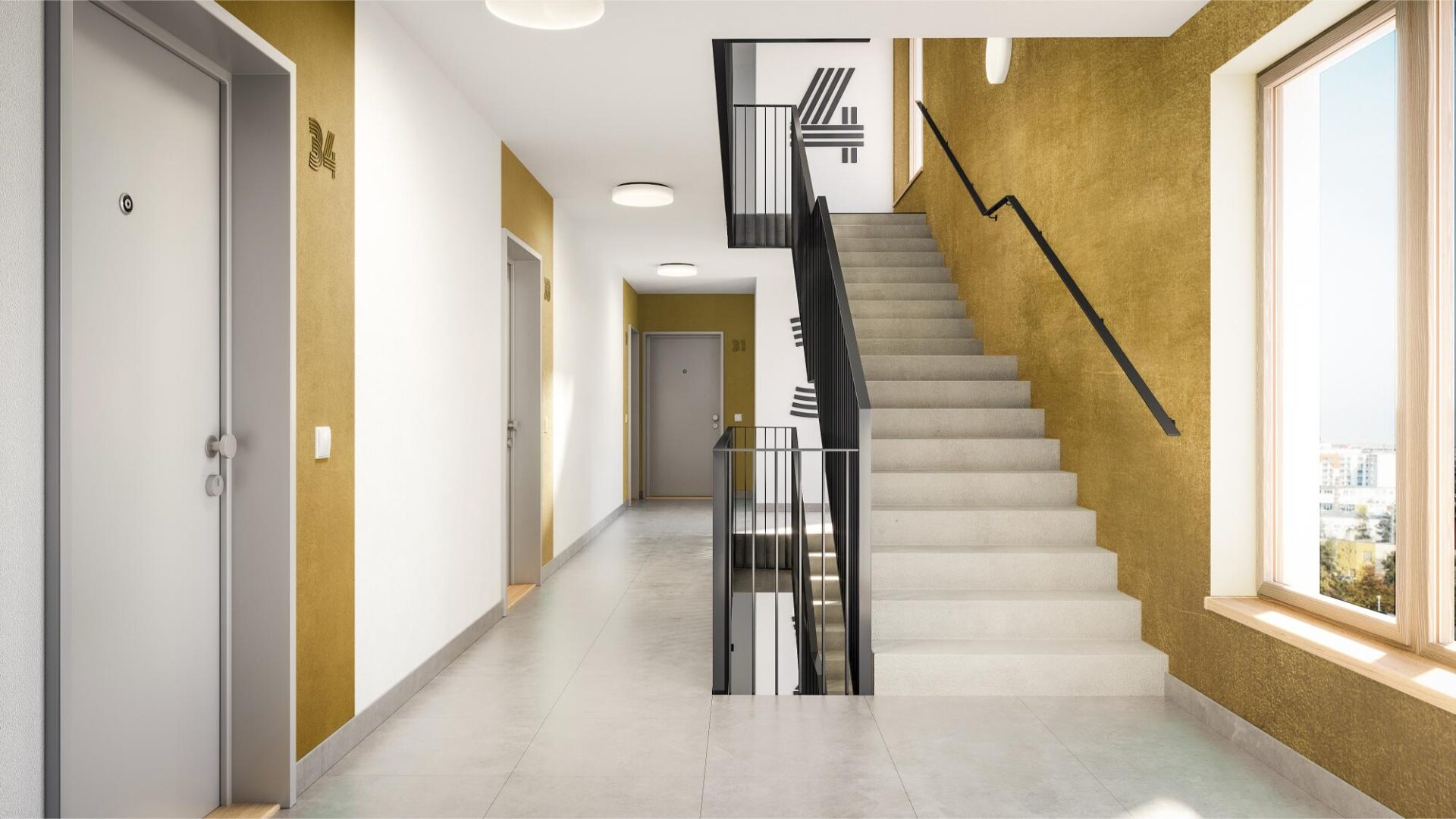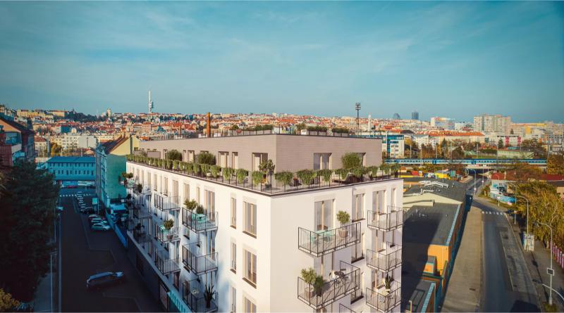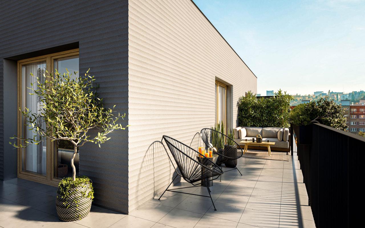 Novostavba bytového domu má 6 nadzemních podlaží a suterén. Poslední podlaží je ustoupené. Hlavní fasády jsou výrazově členěny na tři základní hmoty – šedou hmotu parteru, na které leží hlavní bílá hmota typických, obytných podlaží, na kterou dále navazuje šedá hmota ustupujícího podlaží. Pomyslná „hmota“ v bílé barvě má horizontální proporci. Plocha parteru a ustupujícího patra se od hlavní bílé hmoty proporčně a strukturově odděluje probarvenou reliéfní omítkou. Fasády jsou doplněny balkóny se vzdušným svisle členěným antracitovým zábradlím, které svým detailem zjemňují plochy fasád. Šesté nadzemní podlaží je ustupující o 2 metry. V rámci tohoto ustoupení (ploché střechy), vznikají pobytové terasy. Na střeše objektu se nachází terasa přístupná obyvatelům domu. Bytový dům je dispozičně řešen jako podélný dvoutrakt. Dům má jedno komunikační jádro, propojující jednotlivé podlaží od střechy až k suterénu. Hlavní vstup do objektu je v 1.NP, který je prostorově zapuštěn, v nároží objektu je také zapuštěna hmota parteru, která jej takto podtrhuje a zároveň tvoří městotvorný prvek podloubí. Nachází se zde nebytové prostory – obchodní jednotky.