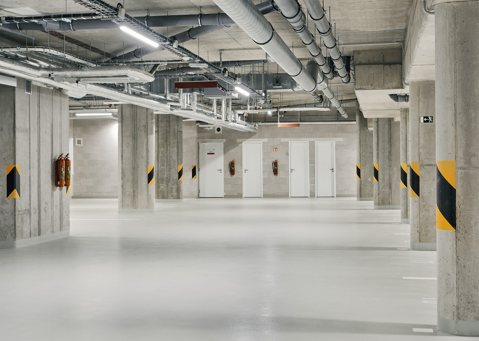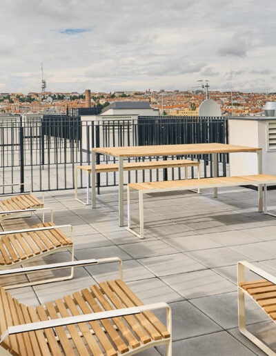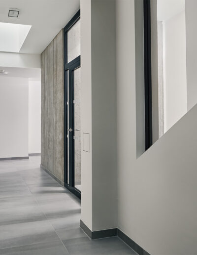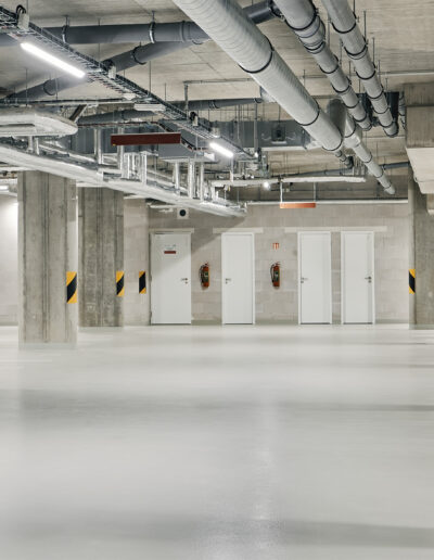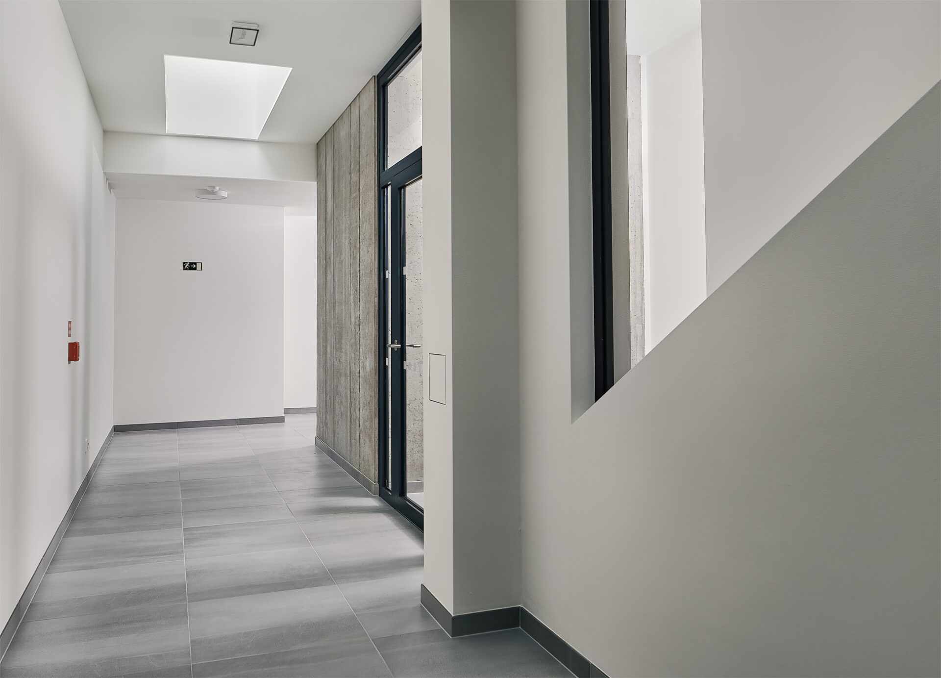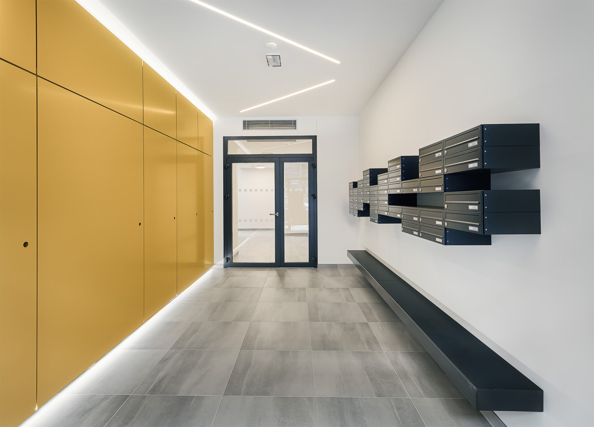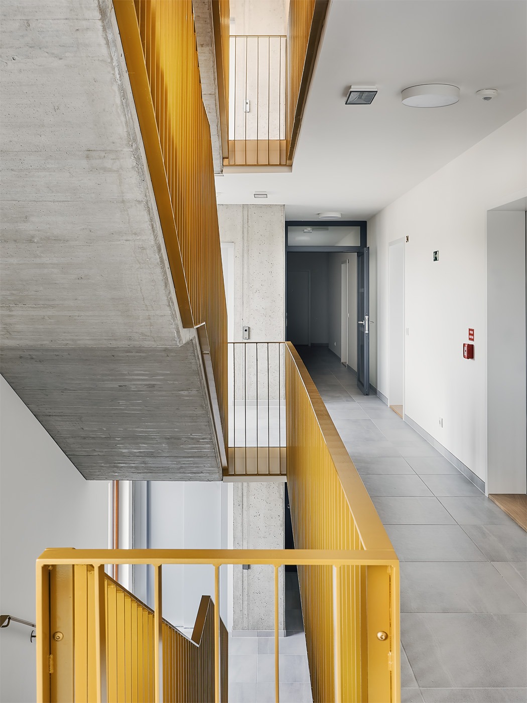 Dominantním prvkem společných prostor je zlaté zábradlí, které se line skrz všechna podlaží. Interiér doplňuje pohledový beton.