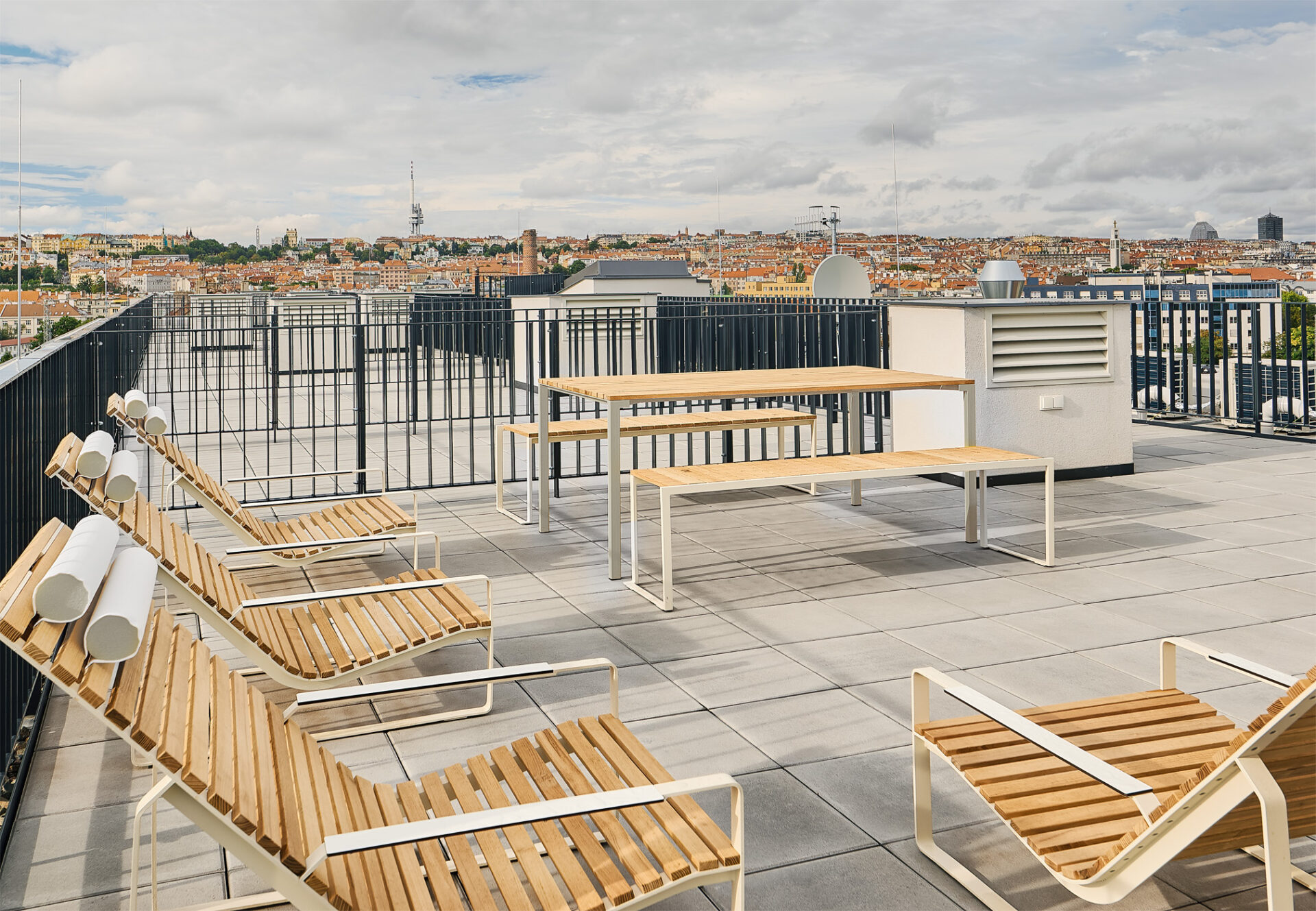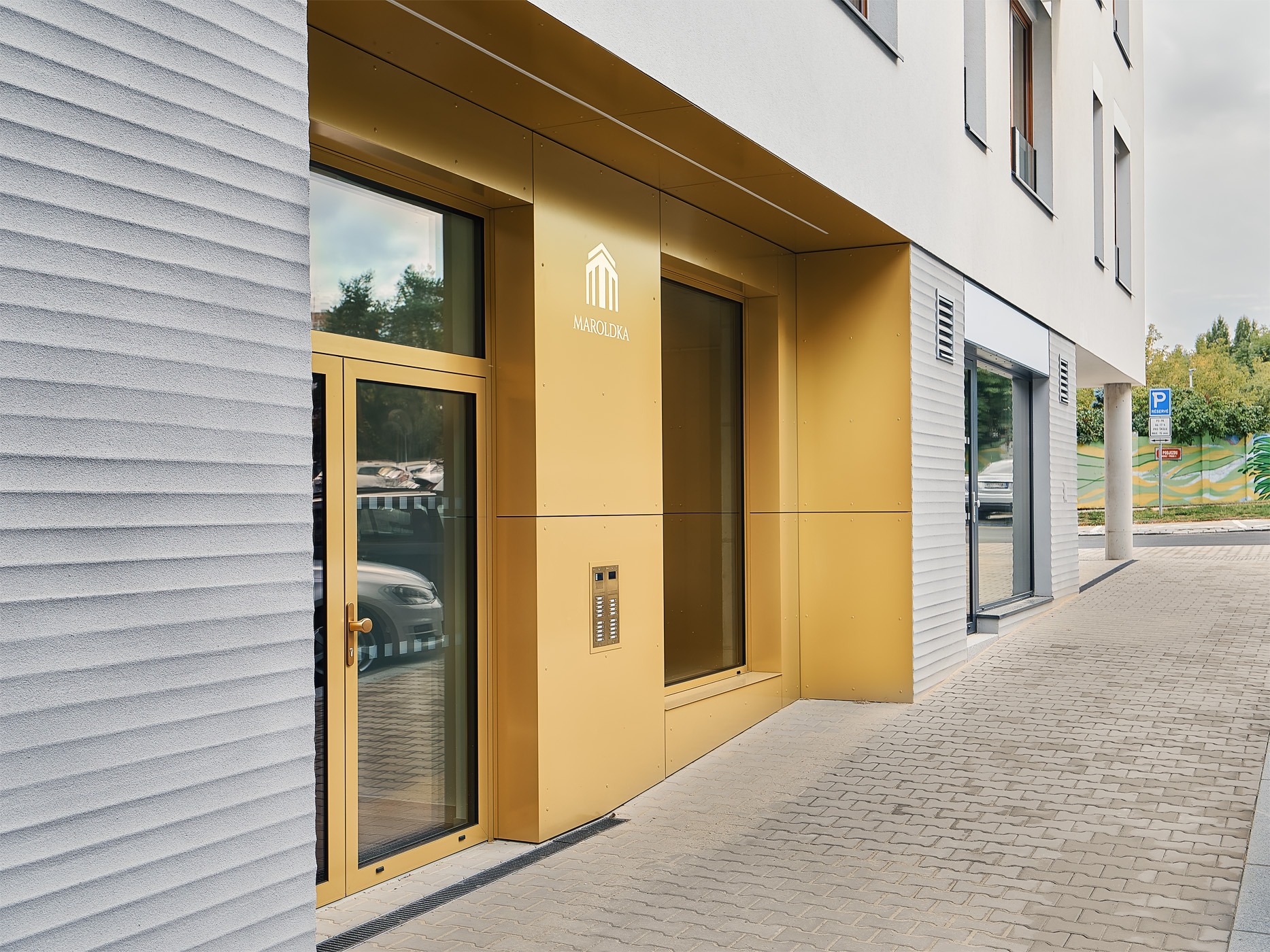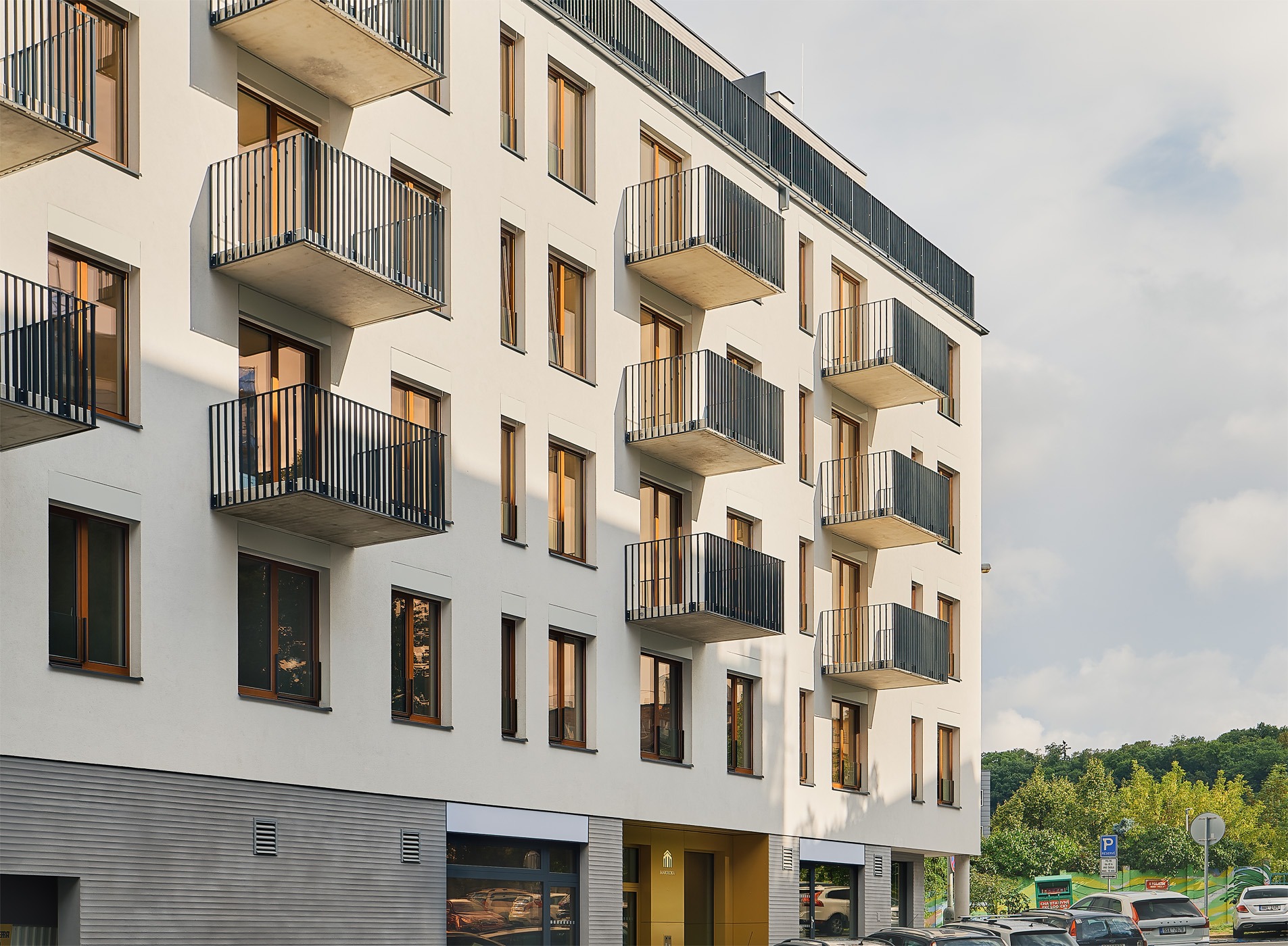 Novostavba bytového domu má 6 nadzemních podlaží a suterén. Poslední podlaží je ustoupené. Hlavní fasády jsou výrazově členěny na tři základní hmoty – šedou hmotu parteru, na které leží hlavní bílá hmota typických, obytných podlaží, na kterou dále navazuje šedá hmota ustupujícího podlaží. Pomyslná „hmota“ v bílé barvě má horizontální proporci. Plocha parteru a ustupujícího patra se od hlavní bílé hmoty proporčně a strukturově odděluje probarvenou reliéfní omítkou. Fasády jsou doplněny balkóny se vzdušným svisle členěným antracitovým zábradlím, které svým detailem zjemňují plochy fasád. Šesté nadzemní podlaží je ustupující o 2 metry. V rámci tohoto ustoupení (ploché střechy), vznikají pobytové terasy. Na střeše objektu se nachází terasa přístupná obyvatelům domu.